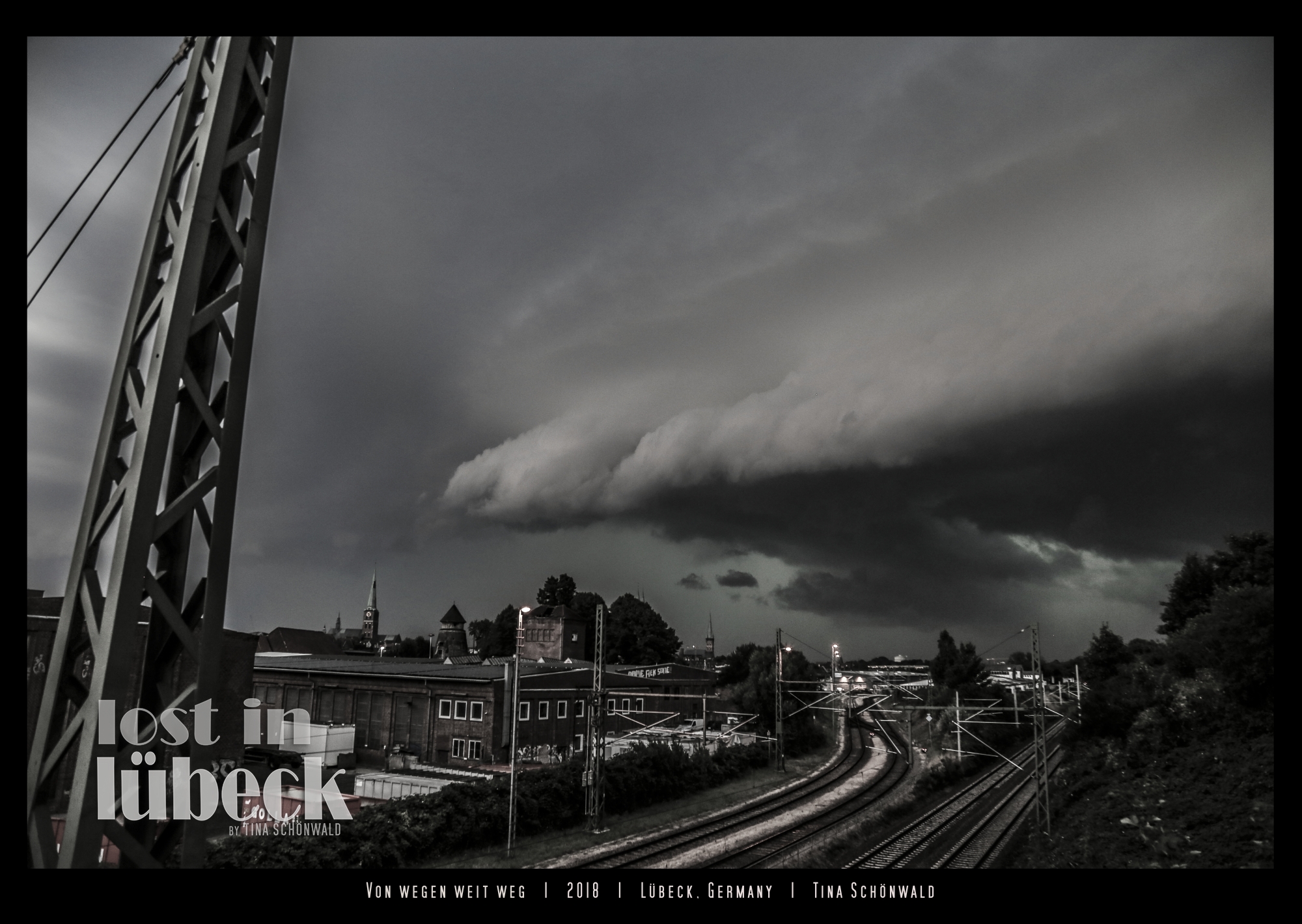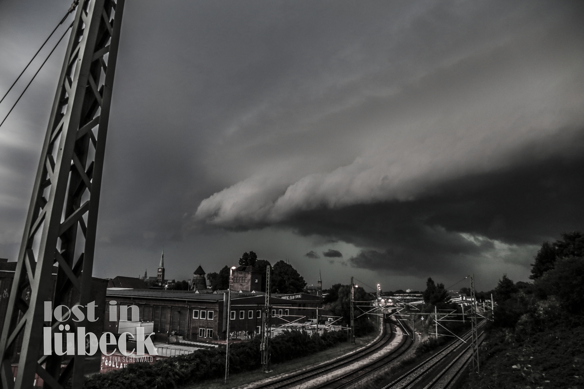 Dann die Einsiedelstraße rein und auf der nächsten Gleisüberführung halt gemacht, wieder voll vertieft, *knipsknipskniiips*. Dann dachte ich: “Oh, es wird dunkler, das ging aber schnell jetzt. Und dahinten, Wahnsinn was für eine schöne Wolke über den Türmen! *dauerknipsknips* Oh man, die wird ja immer größer und dunkler! Mist, es fängt an zu nieseln..egal..Boah, geil, dahinten aus der dunklen Wolke fängts jetzt an zu blitzen, cool, ist ja noch weit weg. (Ich bin ein Schisser wenn ich ins Gewitter komme!) *knipsknipsknips* *einstelleinstell* Wenn ichs schaffen würde einen Biltz über den Kirchtürmen zu fotografieren wär klasse! Hm, ich film jetzt ‘n bisschen! Oha, jetzt werden die Tropfen dicker..oooh, Shit, wo kommt dieser megadolle Wind auf einmal her, ist ja fast orkanartig grad!” In dem Moment beschlich mich ein ungutes Gefühl. Und dann hab ich nach oben geguckt. Die größte, tiefhängendste, schwärzeste Wolke, die man sich vorstellen kann hing direkt über mir! Und wieder mit halboffenem Rucksack halb über der Schulter, in der einen Hand die Kamera, in der anderen den Radlenker ging ich sehr schnell Richtung Staples an der Schwartauer Allee, in der Hoffnung, dass die noch aufhätten. Dabei immer drauf geachtet, dass ich nur die Gummigriffe berühre und nicht den Metalllenker, falls ein Blitz ins Rad einschlägt. Passiert ja alle 5 Minuten sowas, jedenfalls nach den Youtubevideos zu urteilen, die es über Blitzeinschläge so gibt. Ich ging noch schneller, ok, ich lief. Blitze über mir. Magenkrampf. Ich rannte quer über die Straße, wollte dann doch zu nem Gebäudeunterstand, entschied mich im letzten Moment anders, weils mir nicht sicher genug schien, da der Sturm, der schüttende Regen und vor allem das dauernde Geblitze und Gedonner immer noch heftiger wurden. Staples hatte schon zu. Daneben eine Tür zu nem Treppenaus war offen. Das arme senile Fahrrad hab ich ziemlich lieblos draußen fallen lassen und bin ins Treppenhaus gehüpft. SICHERHEIT! Kann sein, dass ich übertreibe mit meiner Angst, die vielleicht auch daher rührt, dass ich mal vom krachenden Donner aufgewacht bin und gleichzeitg den Blitz gesehen habe, weil er eine Straße weiter eingeschlagen hat. Jedenfalls wars heute sehr aufregend, also für mich, und ich bin gespannt was da für Fotos bei rumgekommen sind. Das Filmchen, was ich leider abbrechen musste, als ich die Gewitterwolke über mir entdeckte, gibts hier zu sehen.